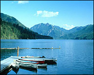 - Lake Crescent is a crystal clear 12-mile long lake located 17 miles west of Port Angeles on Highway 101. The glacier-carved lake offers swimming, boating and fishing. There are numerous places to get away from it all and to soak in the awesomeness of nature. Marymere Falls is a mostly level one mile hike from Storm King Ranger Station. This walk takes you thru the forest of moss covered trees and large ferns. The Pyramid Mt. Trail reached from the North Shore Road offers an excellent view of Lake Crescent, Mt. Storm King and the blue-green slopes of Aurora Ridge. One can also hike along the north side of the lake on the Spruce Railroad Trail (named after the railroad that was there during WWI). The rail was used to haul out spruce to make airplanes for use in the war.